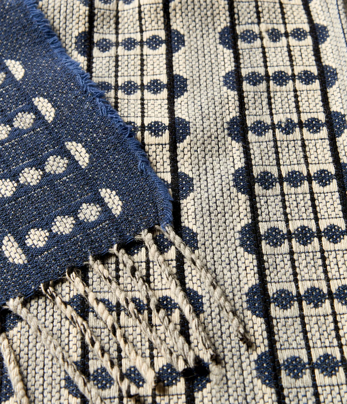 Tecelagem feita em tear ancestral, acabada à mão por mestres de um saber transmitido entre gerações.