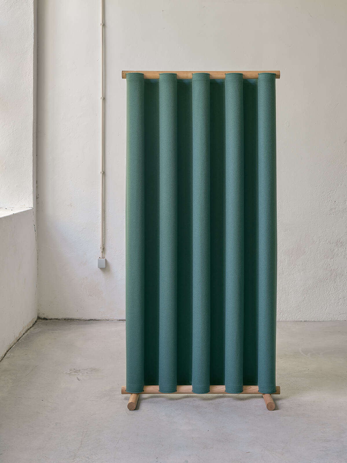 Inspiriert durch die außergewöhnliche Schallabsorptionsleistung von Burel-Vorhängen – 95 % bei 100 % Schall – ist auch der leistungsstarke Raumteiler ein echtes Highlight ökologischer Nomade. Es ist für den Transport vollständig zerlegt und wurde nach den Grundsätzen des Demontagedesigns (nachhaltige Rückbaumethoden) konzipiert.