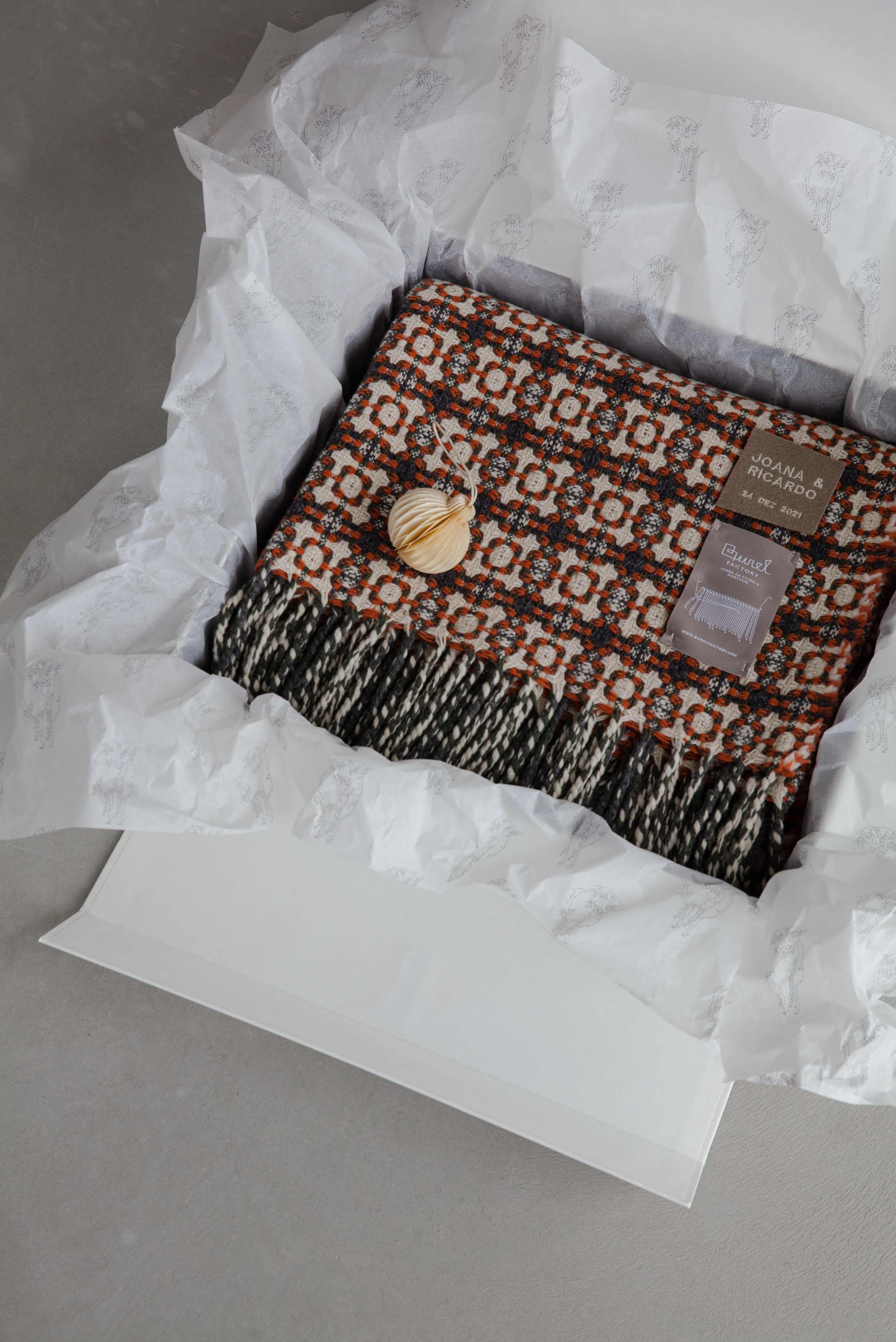 Kleine Decke mit besticktem Etikett mit persönlicher Botschaft und Geschenkbox.