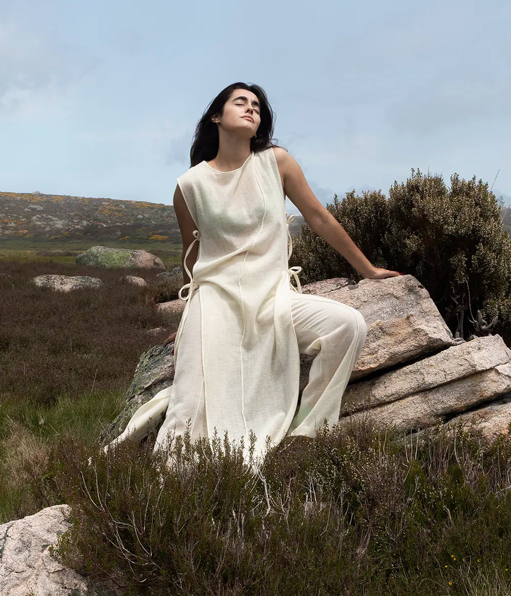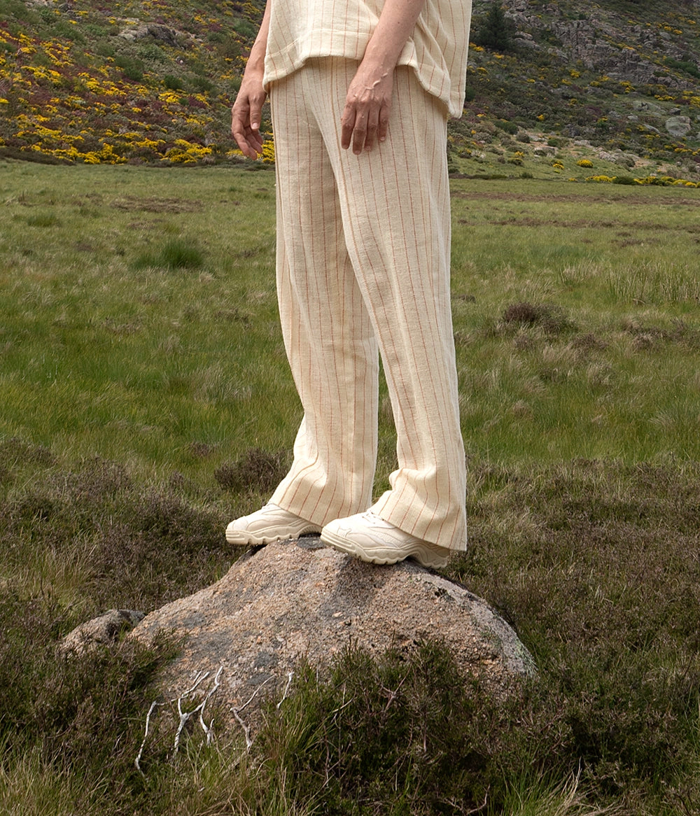 Die Wolle in unseren Stoffen stammt von glücklichen Schafen, die frei in den Bergen der Serra da Estrela grasen. Die Produktion erfolgt auf Webstühlen aus dem frühen 20. Jahrhundert, von mehreren Händen, die noch immer die Meisterschaft der Zeit bewahren, als die Industrie noch von Hand betrieben wurde, und die Produktion bewusst und ausgewogen anpassen.