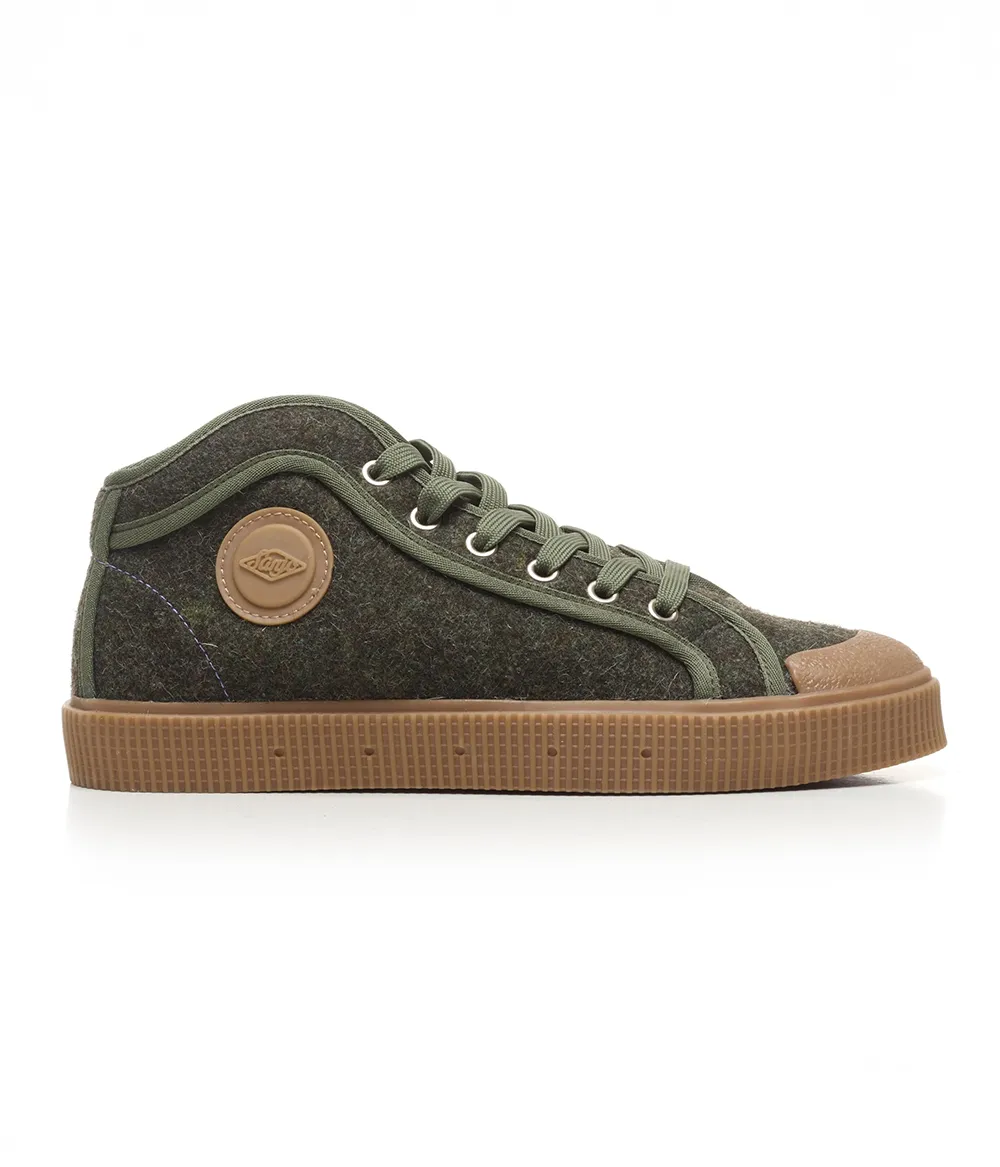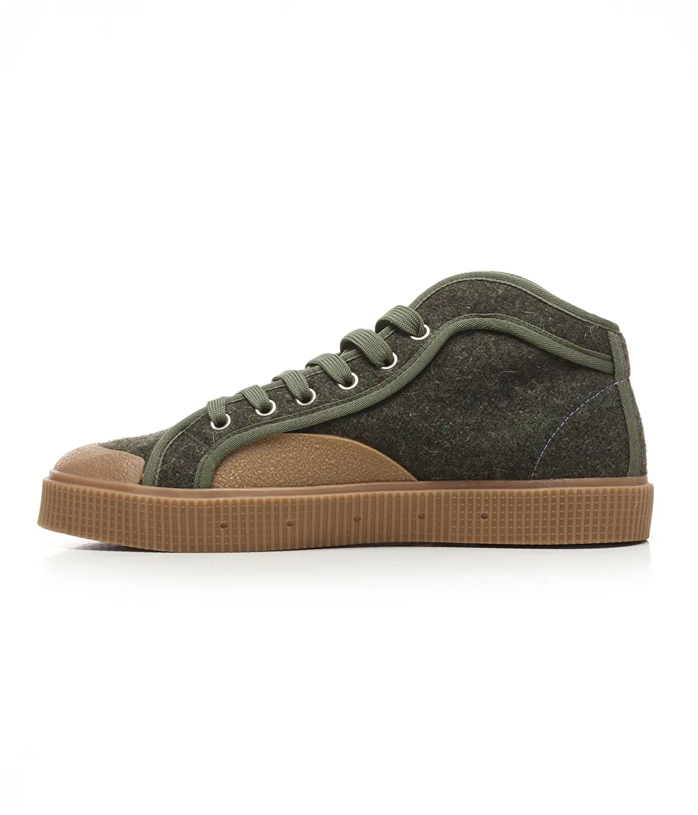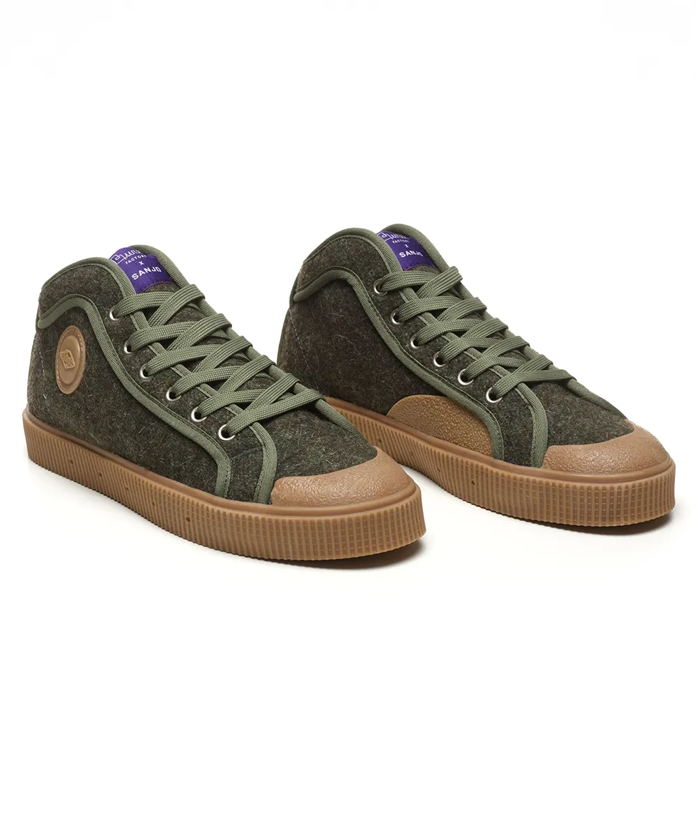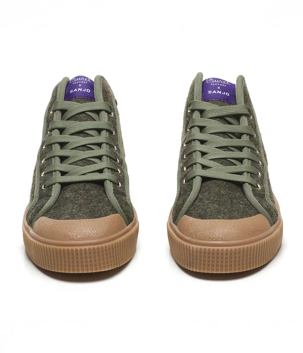 Sanjo's iconic sneakers, now covered in burel for greater warmth, comfort, and rain resistance.