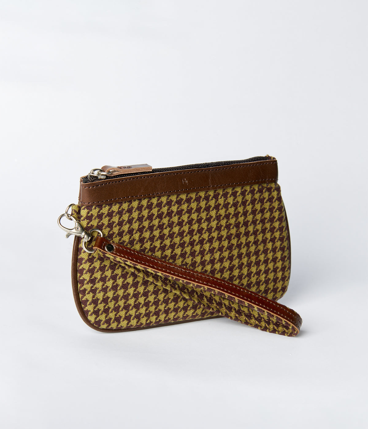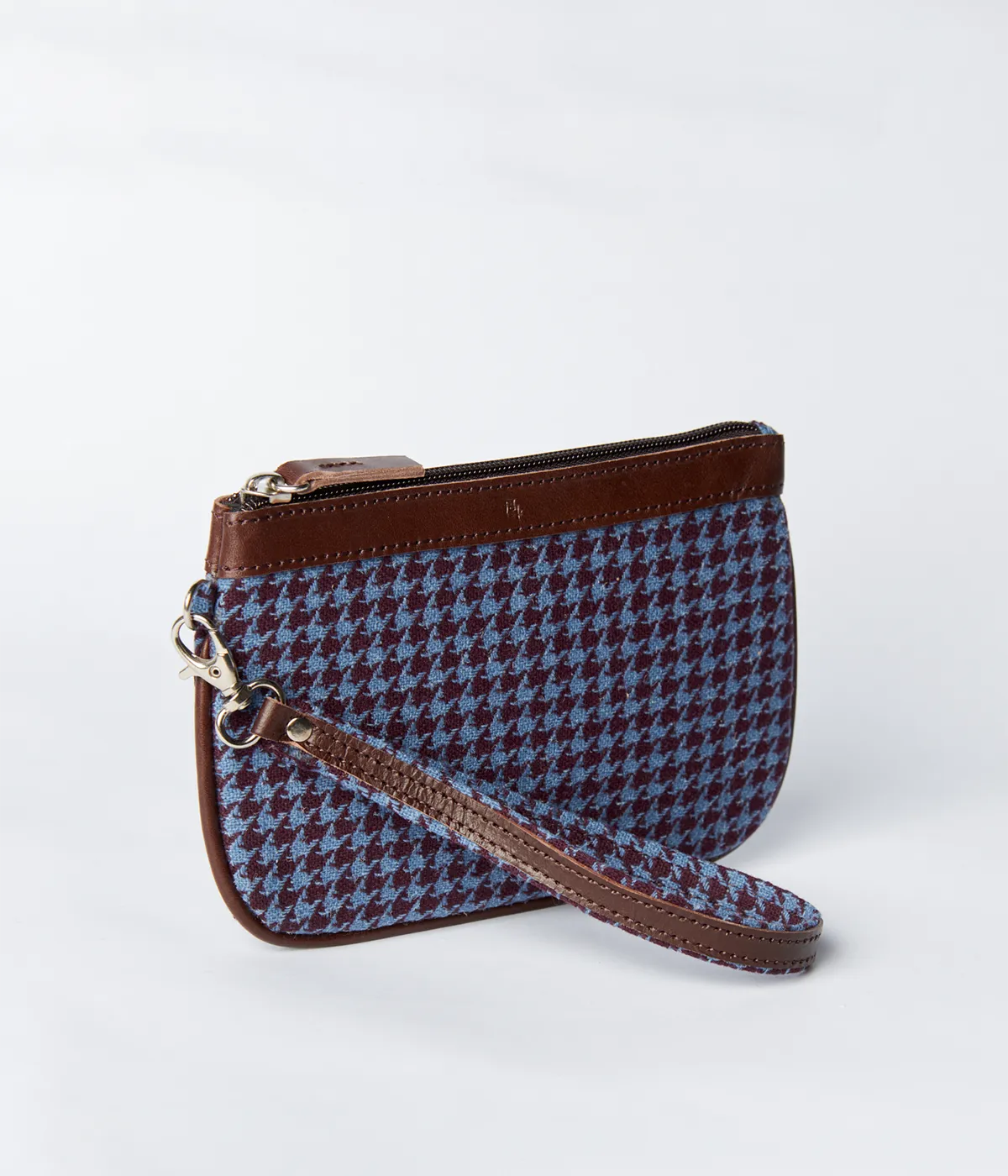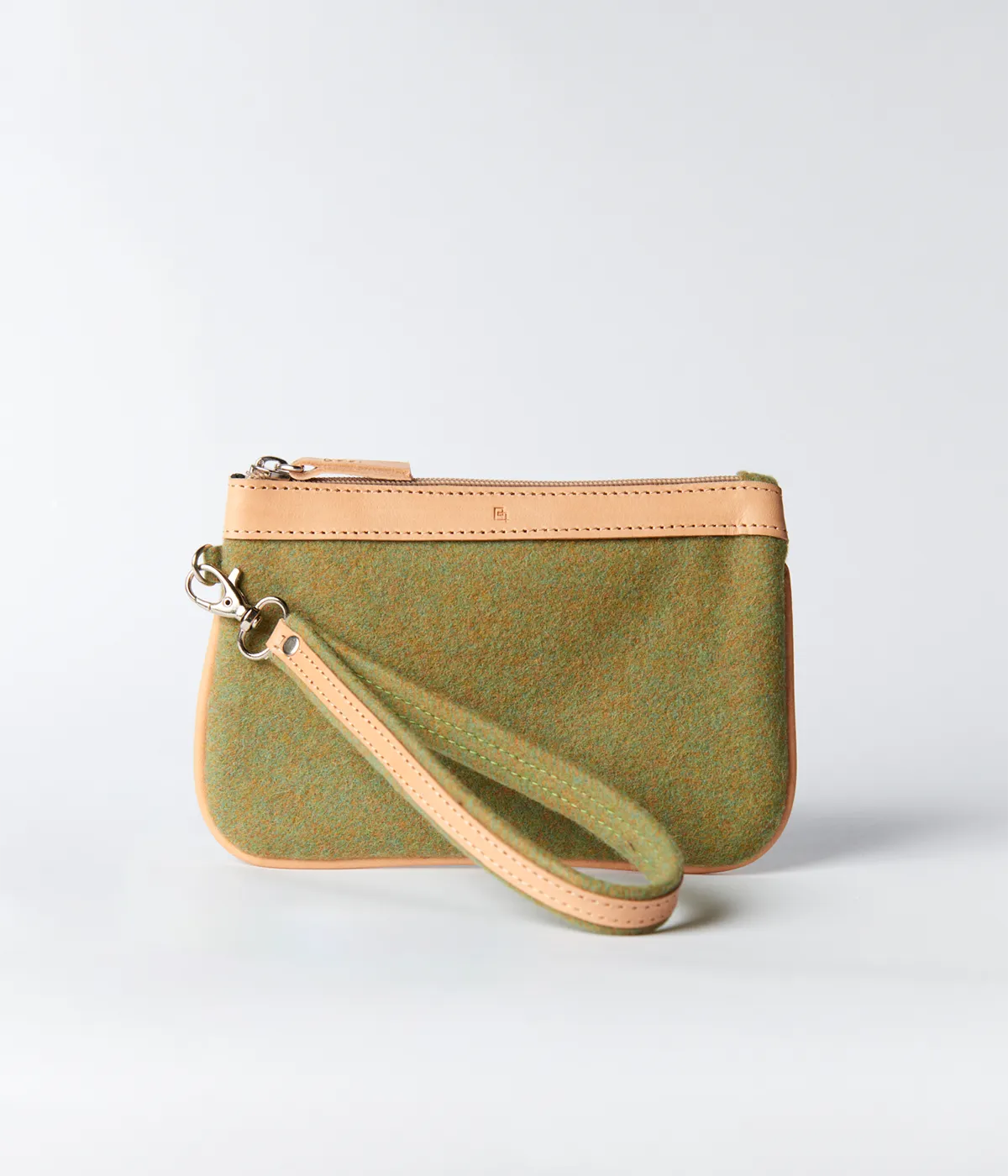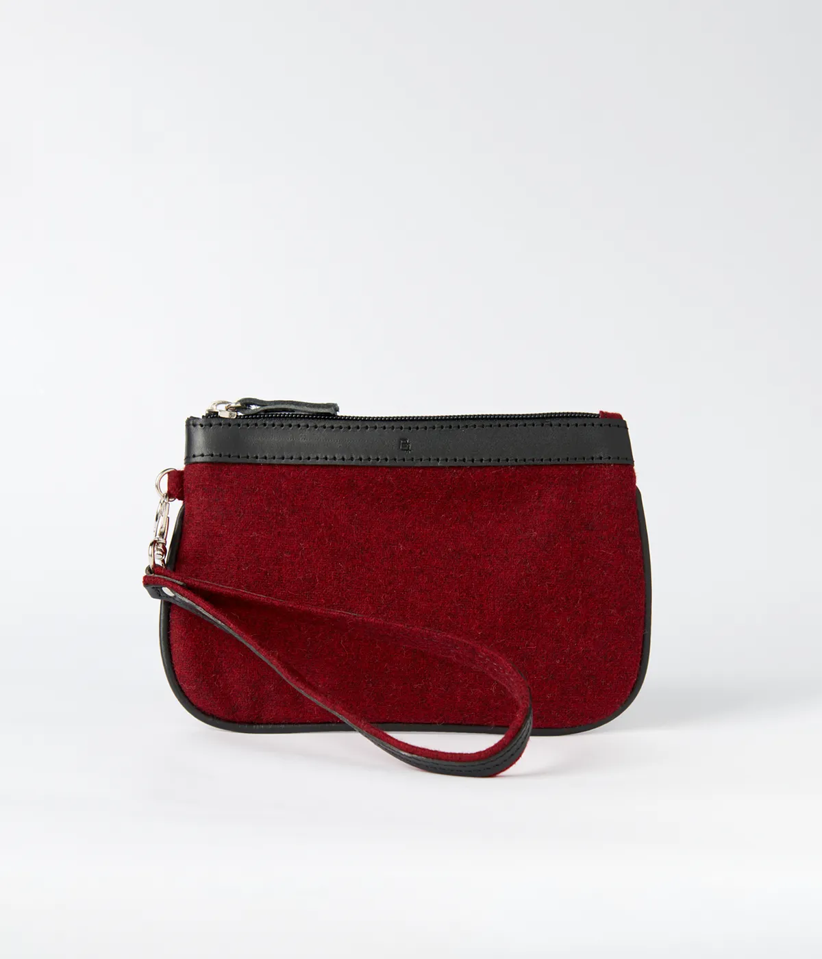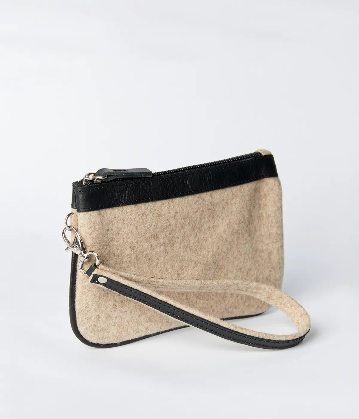 Bolso pequeño en burel y piel, con cremallera y correa desmontable.