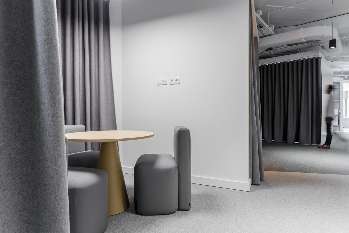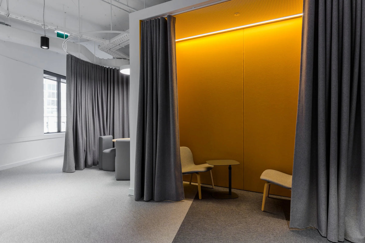 Neste projeto foram desenvolvidas e aplicadas caixas acústicas suspensas revestidas a burel liso, concebidas para reduzir o tempo de reverberação e controlar a propagação sonora em áreas amplas. A intervenção ao nível do teto permitiu melhorar o conforto acústico sem comprometer a leitura do espaço. A densidade natural do burel reforça a absorção sonora, garantindo simultaneamente resistência e estabilidade ao longo do tempo.